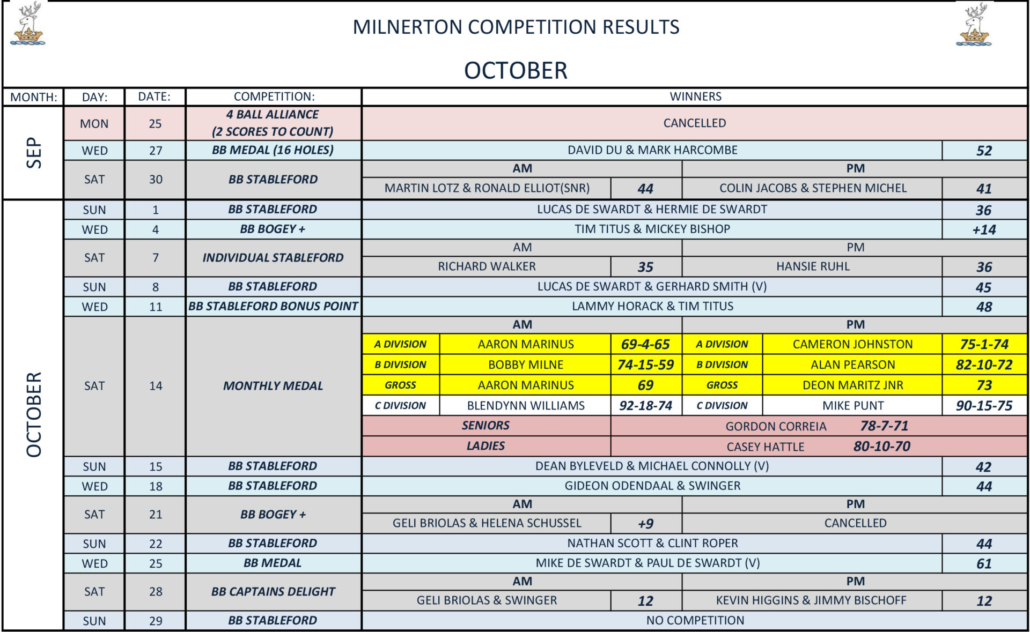 | Monthly Medal & Putting | 14 Oct (Sat) | Winners – (Best nett) – Casey Hattle |